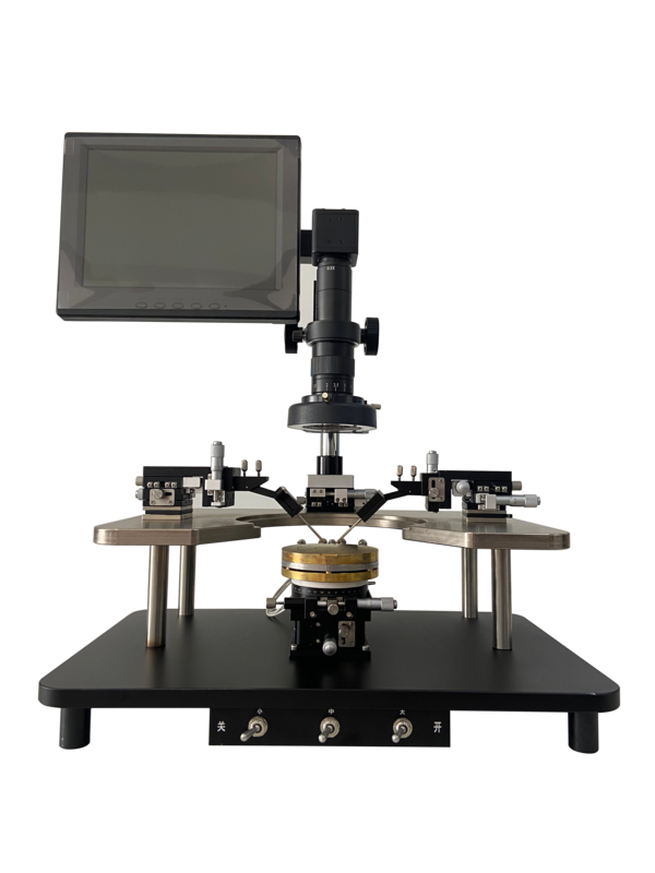 探针台是一种辅助执行机构,测试人员把需要量测的器件放到探针台载物台(chuck)上,在显微镜配合下,X-Y移动器件,找到需要探测的位置。接下来测试人员通过旋转探针座上的X-Y-Z的三向旋钮,控制前部探针(射频或直流探针),有效的扎到被测点,从而使其讯号线与外部测试机导通,通过测试机测试人员可以得到所需要的电性能参数。